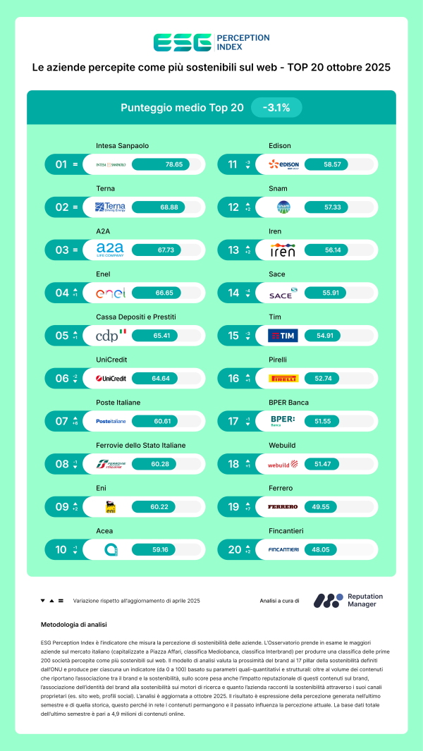 È quanto rilevato da ESG Perception Index, l'osservatorio che misura la reputazione di sostenibilità delle aziende, curato da Reputation Manager S.p.A. Società Benefit.