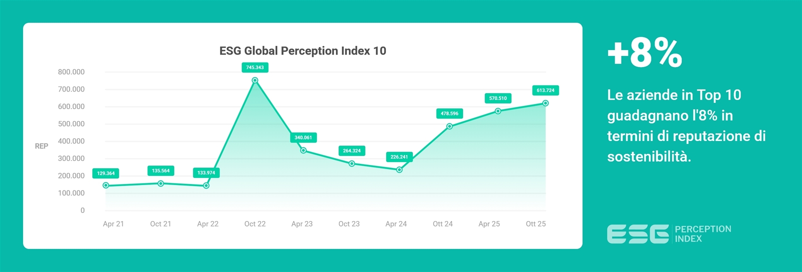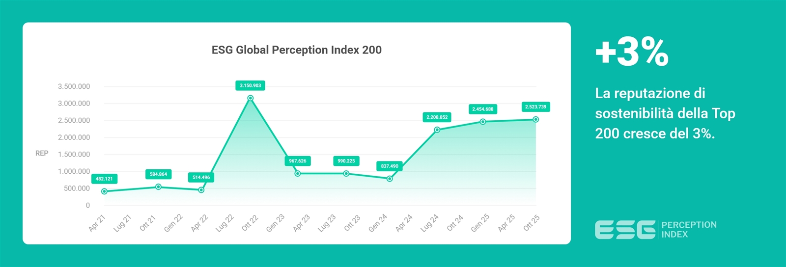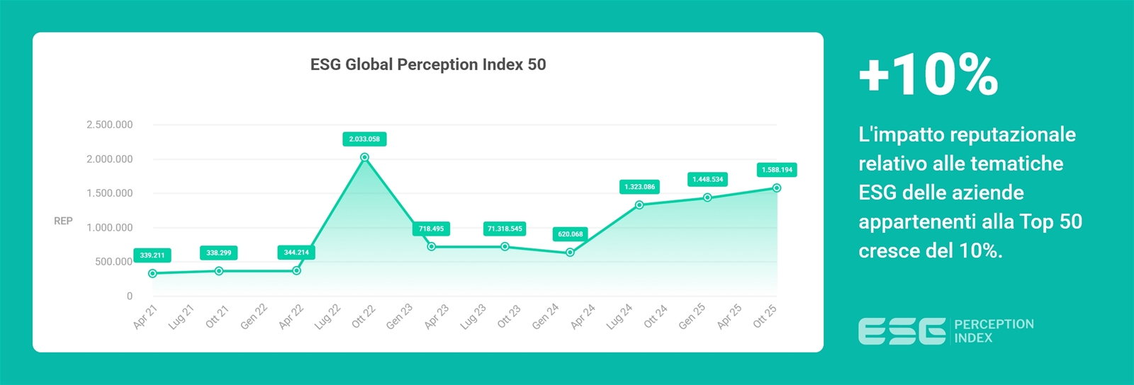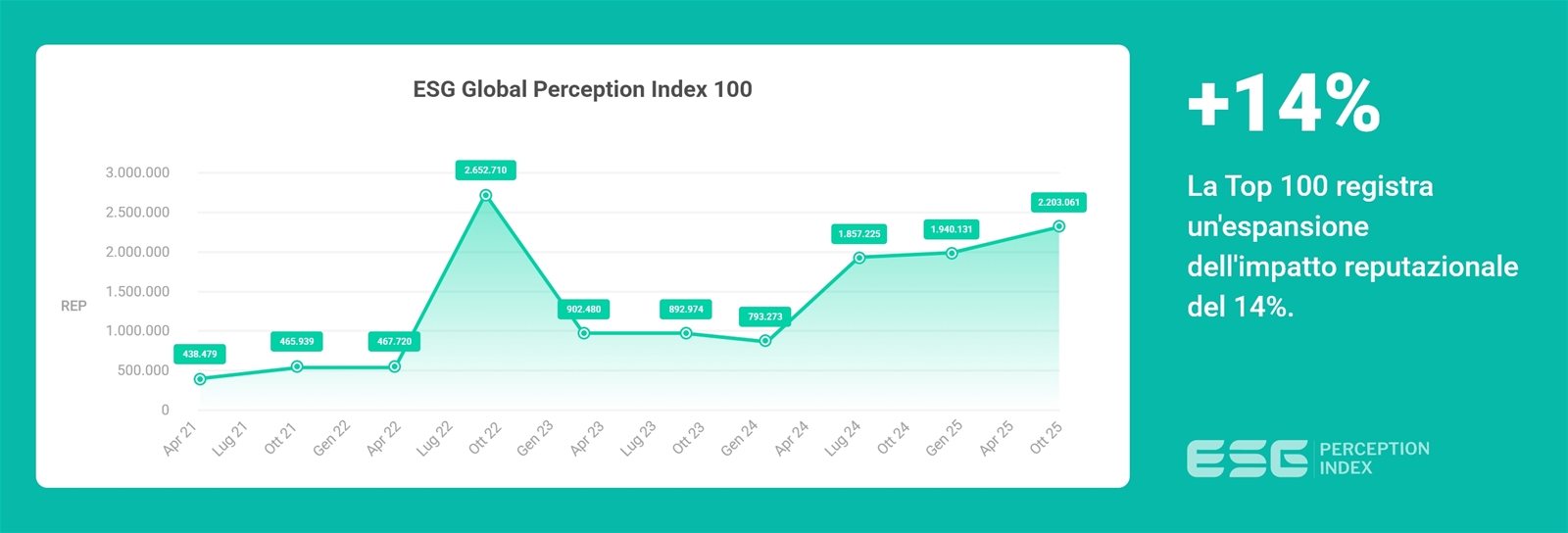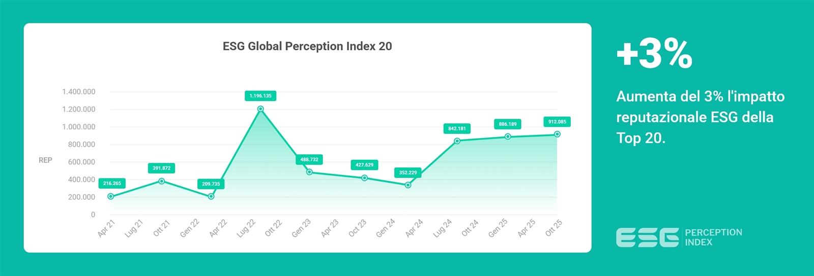 L’analisi dell’andamento nel tempo dell’ESG Global Perception Index® – che esprime in termini assoluti il valore REP generato dai contenuti analizzati – permette di identificare tendenze, divisioni e cambiamenti casuali o strutturali utili per un'analisi predittiva e per l'identificazione di una “specifica linea di tendenza in evoluzione” dell'entità analizzata.
