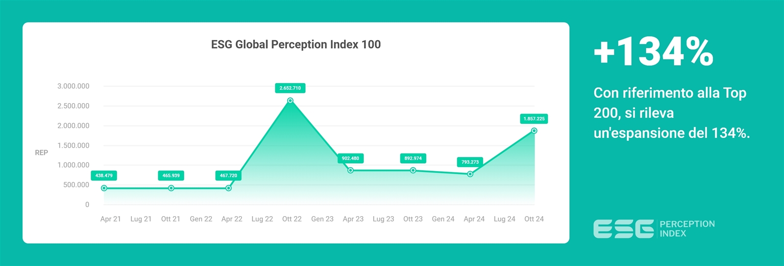 ESG Global Perception Index® è l’indice che monitora la percezione di sostenibilità delle aziende. L'indice è calcolato e diffuso da Reputation Manager® , società leader in Italia nell'analisi e gestione della reputazione.